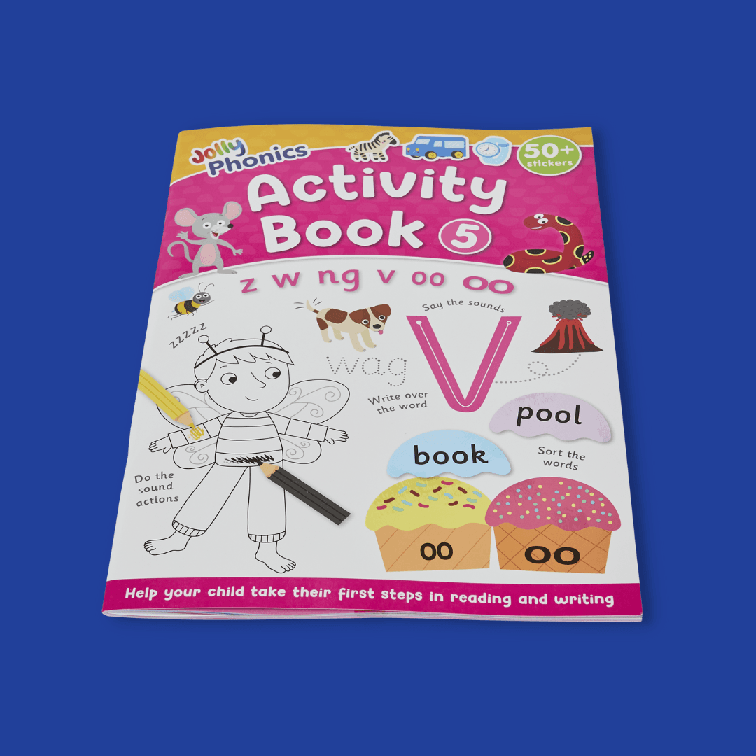 Activity Book 5 takes children to the next stage of their Jolly Phonics journey with the sounds z w ng v oo oo. Inky Mouse, Snake and Bee go on new adventures, and each sound is introduced with its own short story, action and activity set so children can hear it, say it and write it with growing confidence.